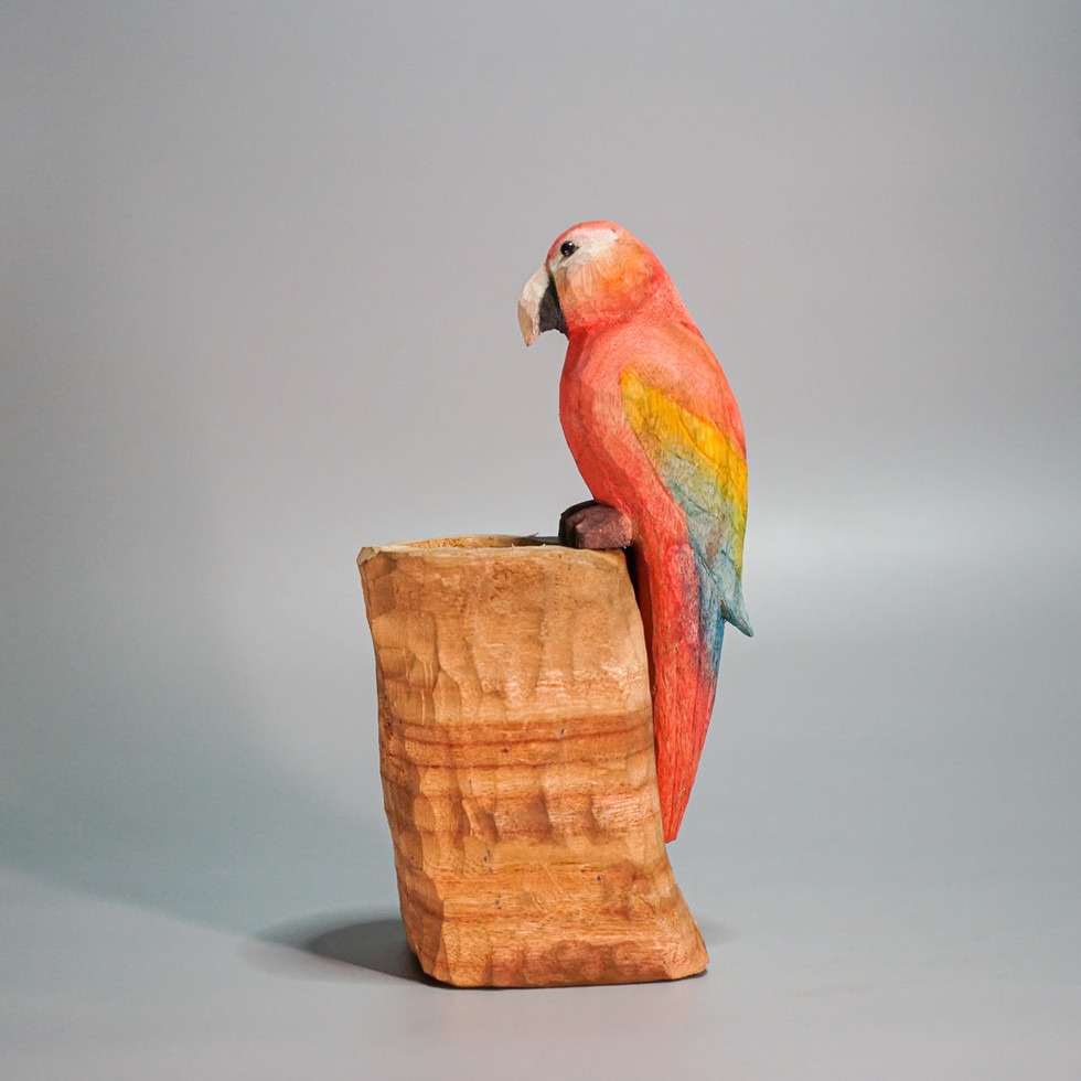 學員王羽曾在旅遊時買了一件小鳥木雕的紀念品,因長期放置在戶外,日曬雨淋讓使其褪色。但王羽太喜歡它的可愛模樣,所以決定再做一隻動態類似的小鳥,並用自己的方式重新詮釋顏色與細節。重現動態的前置作業是捏塑,透過油土模型讓她更清楚什麼地方可以做得比原本的紀念品更好,再來就是細節的處理也更為精緻,刀法的表現也更有層次。最後作品能看到重新製作的小鳥有了全新的刀痕佈局與上色搭配,延續了原本木雕小鳥的美好,也注入了當下自己新的想法。