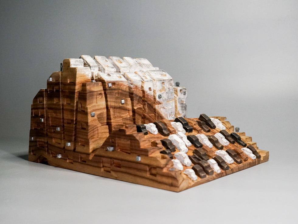 環保是守安近期的創作⟪陸海空髒兮兮系列⟫探究的主題,他在作品裡提出了他對於未來的想像與當下我們能做的可能,因此在欣賞作品時不由捫心自問。此件作品背面有個深又大的凹洞,位置就在象徵人類文明的白色巨大建築背後。他想像未來若有一天 , 車輛越來越多 ,且空氣汙染嚴重並失控,上面的房子也無法再收留人類,而這裡也許會是一個暫時讓人暫時喘息的避難所吧?