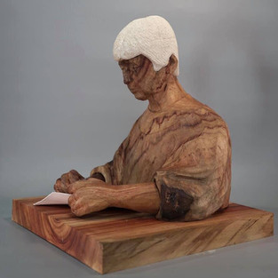 上次學員何先生雕刻了《拉小提琴的父親》送給在法國的母親,這次趕在聖誕節前他也完成了要送給父親的《刺繡的母親》。和前一件作品一樣,這次仍然是保留木頭原色,但在頭髮的表現他使用了石灰岩來做雕刻,透過白色的石頭來表現母親的白髮。這件作品難度依然不低,但雙手的表現與榫接比起上次更進步熟練。